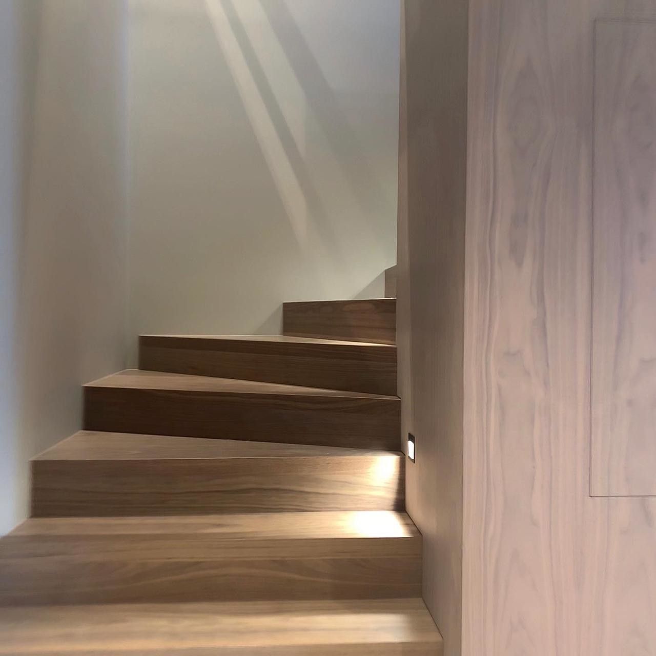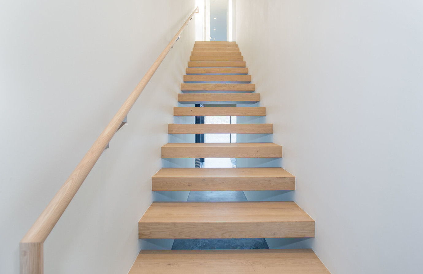 Unlike the majority of floor manufacturers that supply separate nosing which is connected to standard floorboards at the job site, we prefer to supply entire factory assembled treads instead. Gluing the nose to the tread in the factory, without any mitre cuts, allows us to craft a far more sustainable construction and sophisticated aesthetics. Risers are usually supplied separately and are connected to the treads at the job site during installation. Head ends can be covered with end grain veneer in case they are exposed.