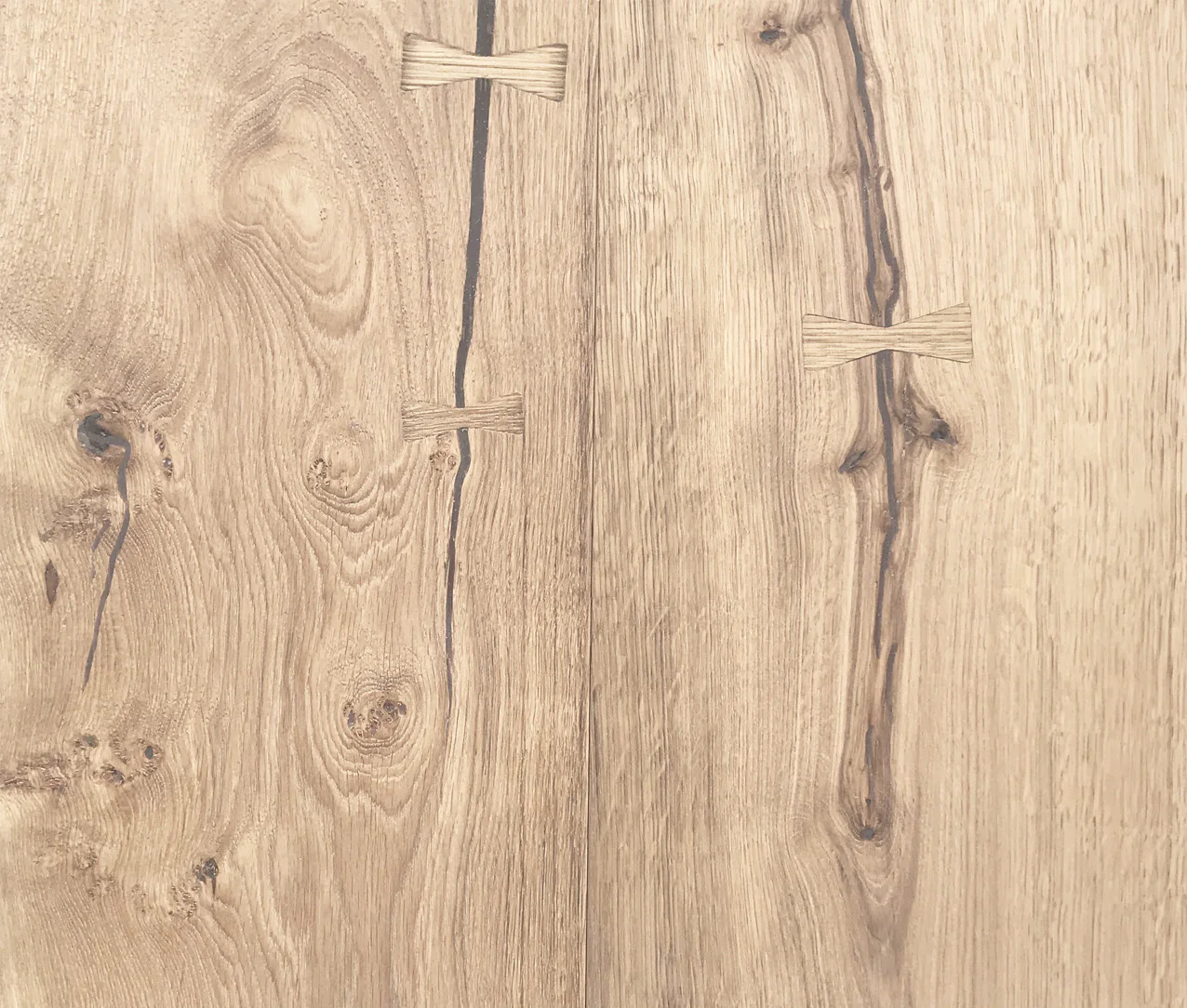 We offer a service/option to supply our floors with bowties. The bowties are crafted by hand, usually onto a XXL plank. The bowties leave a very authentic, artisanal touch on your quality wood floor and enhances the bespoke experience. Secondly, with this option, the client allows us to use more of the precious wood (majestic oak trees of more than 150 years old), of which the availability is rather limited. Unless agreed otherwise, we supply approximately 30-40% of planks with larger (end) cracks with bowties.