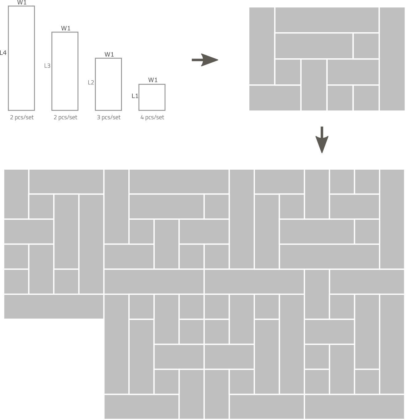 The CREATIVE pattern allows you to design your own custom geometrical wood floor. It consists of 4 different elements in fixed lengths. Each length represents a multitude of the width of the board. A pre-defined number of each element is assembled into one packing unit, which is illustrated below. In order to emphasize the pattern, each element is given a shadow bevel of 2 mm.